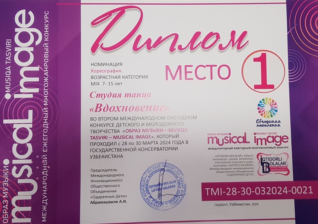 В рамках Всемирного дня театра, Государственный театр музыкальной комедии (оперетты) Узбекистана поздравил учащихся «Театрально-танцевального кружка» (при Театре Оперетты) студию танца «Вдохновение» (руководитель солистка балета, мастер сцены Г.Мамбекова) с международной наградой, присвоением призового диплома первой степени в номинации «Хореография», полученного в рамках Второго ежегодного международного конкурса детского и молодёжного творчества «ОБРАЗ МУЗЫКИ – MUSIQA TASVIRI – MUSICAL IMAGE», который проходил c 28 по 30 марта 2024 года в городе Ташкенте.